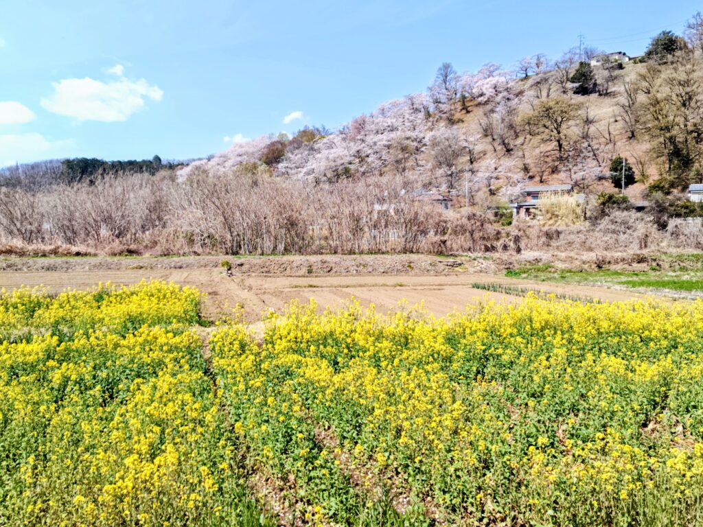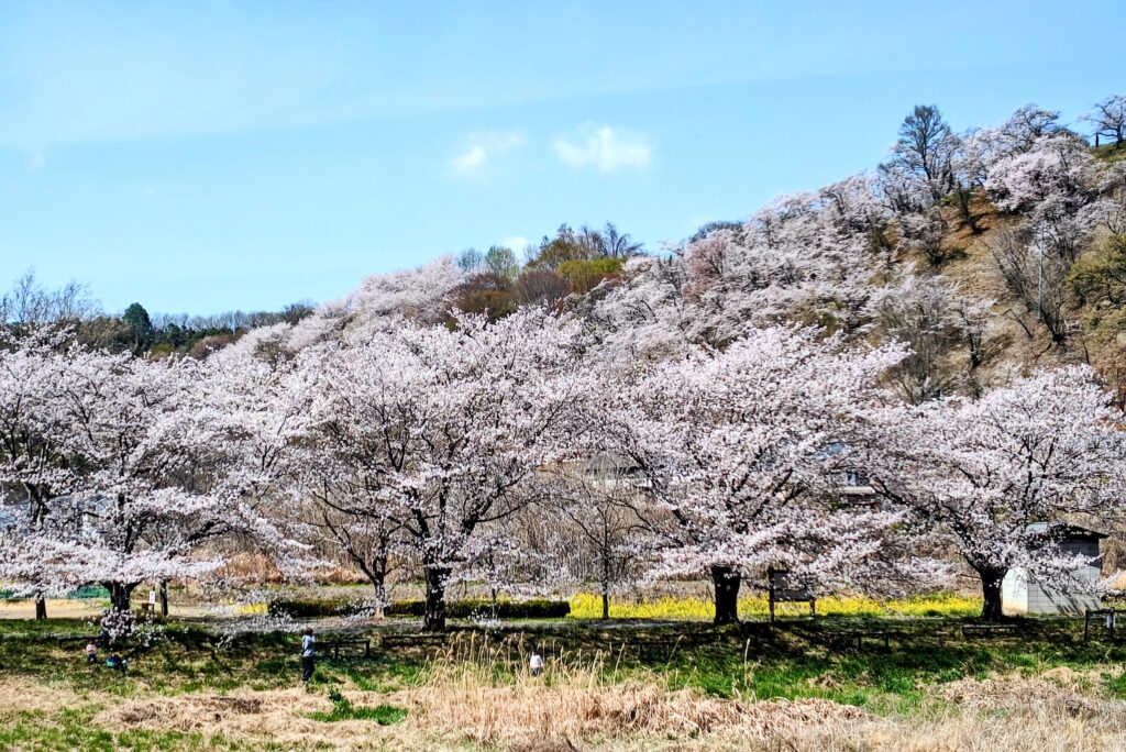 川の両側と小高い山の側面に見た目で100本くらい桜の木があります。